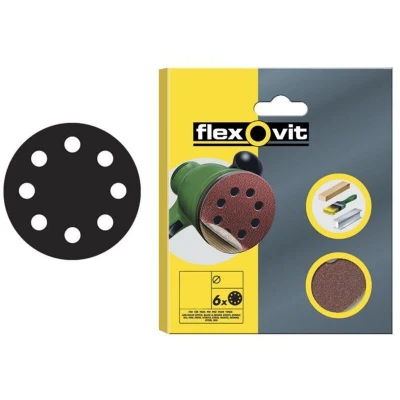 General description Pack of 6 Assorted Flexovit Hook & Loop Sanding Discs 115mm. These sanding discs are made from tough and sharp high-performance aluminium oxide, combined with a heavy paper backing, making them extremely durable and long-lasting. They are ideal for general-purpose sanding and stock removal. Technical specifications Size: 115mm Number of holes: 8 Compatibility and accessories Designed to fit sanders with 8 dust extraction holes Compatible with most brands of eccentric sanders due to hook & loop backing Usage Suitable for use on wood, paint, and metal