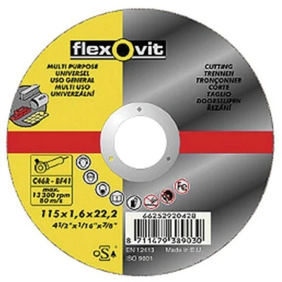 General description The Flexovit Multi-Purpose Cutting Disc is designed for cutting a variety of materials including steel, stainless steel, aluminium, stone, ceramics, and tiles. It offers efficient cutting performance with reduced noise and dust, minimizing workpiece wastage. Suitable for general building and DIY projects, this disc provides a versatile solution for different cutting needs. Technical specifications Diameter: 230mm Width: 1.9mm Bore: 22.23mm Maximum RPM: 13,300 Compatibility and accessories Compatible with standard angle grinders and cutting tools that accept a 230mm disc Installation Ensure the power tool is unplugged before installation Attach the disc securely to the tool's arbor, following the manufacturer's instructions Check that the disc is properly aligned and tightened before use Usage Use appropriate personal protective equipment such as gloves and eye protection Operate at the recommended maximum RPM Apply steady pressure during cutting, avoiding excessive