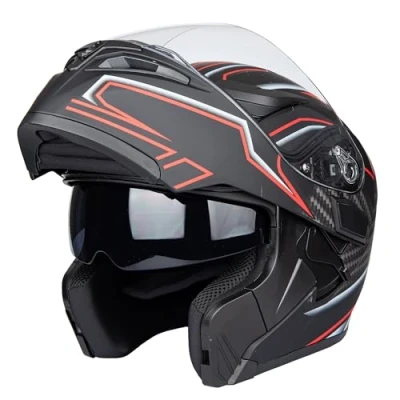 1,Size Fits head circumference: 22.4" to 25.2"(57-64cm),Our products may be bigger one size than other brands, Please choose a smaller size if you like. 2,Meets or Exceeds FMVSS-218 DOT and ECE 22.05 Safety Standards 3,Flip up modular helmet with heavily cushioned and comfortable interior 4,Double visors design and air vent design; Tough & high elastic front visor - wear-resistant and impact-resistant for better protection 5,Helmet Liner / Cheek Pads are Lightweight, Soft and Easily Removable and Washable;High Resistance ABS Shell With Micrometrically Adjustable Strap