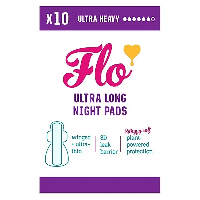 Flo Bamboo Night Period Pads Ultra Long, Super Absorbent, Soft Sanitary Towels 4 Wings, Breathable for Heavy Flow 10 Count