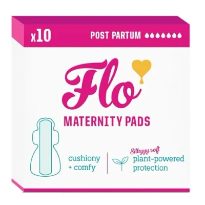FLO Maternity Pads with Wings, Organic Bamboo Sanitary Towels Wings Extra Long, Biodegradable, Soft, Ultra Absorbent & Leak Proof Protection 10 Pack