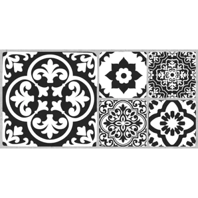 Black and white boho-style peel and stick floor tiles by FloorPops Peel and stick to apply Easy installation - no grout or special tools needed Water resistant and washable Contains (5) 24-in x 12-in tiles Each tile measures 12-in x 24-in 1 pack of tiles covers 10 square feet Virgin vinyl material with a textured low lustre finish and permanent adhesive makes tiles durable Perfect for quick and easy floor transformations