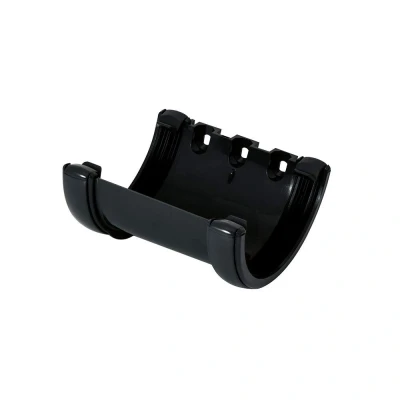 The FloPlast 112mm Half Round Union Bracket in black is perfect for the FloPlast guttering system. Use a FloPlast adaptor for compatible systems. Made in the UK, this lightweight and durable bracket is crafted from recyclable PVCu and comes in recyclable packaging. Its sleek black finish fits any home colour scheme. It connects two lengths of round line gutter for efficient rainwater removal, suitable for new builds and refurbishments. The bracket is Kitemarked KM501316 to BS EN 607, ensuring durability and longevity with a 10-year colour and performance guarantee. Follow FloPlast's installation and care instructions to maintain the guarantee.. FloPlast Plastic Guttering 112mm Half Round Black Union Bracket uPVC