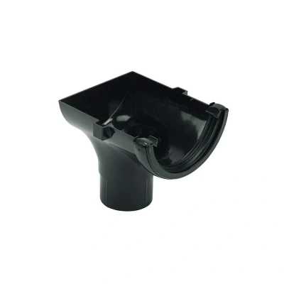 This FloPlast 112mm Half Round Stopend Outlet, in sleek black, serves as an outlet for a 68mm round downpipe at the gutter's end. It offers excellent flow capacity for rainwater removal, suitable for new builds, refurbishments, conservatories, or extensions. The modern black finish allows it to match existing guttering and enhance your home's exterior. Manufactured in the UK, it is lightweight, durable, and made from recyclable materials, including its packaging. Secure it with two 25mm x 5mm screws using the clip system. The product features a 10-year colour and performance guarantee. It is compatible with most plastic guttering systems adhering to BS EN 607 and BS EN12200 standards. Ensure you follow FloPlast's installation and care instructions carefully to maintain the guarantee. This product is part of FloPlast's environmentally friendly range.. FloPlast Plastic Guttering 112mm Half Round Black Stopend Outlet uPVC