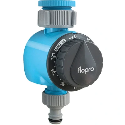 General description The Flopro Mechanical Timer is constructed from premium-grade plastic and features a manual override for added convenience. It enables automatic watering of your garden, making it ideal for use with irrigation systems or sprinklers to water your lawn. You can pre-set the watering duration for up to 120 minutes in 15-minute increments, and it requires no batteries for operation. Technical specifications Material: Premium-grade plastic Maximum watering time: 120 minutes Increment: 15 minutes Hose diameter compatibility: 25mm (1 inch) with inserts for 19mm (3/4 inch) and 12.5mm (1/2 inch) Compatibility and accessories Compatible with most irrigation systems and sprinklers Includes connectors with a snap-fit design for various watering brands Installation Connect the timer to your garden hose or irrigation system using the compatible connectors Ensure a secure snap-fit connection Set the desired watering duration using the timer controls Usage Pre-set the watering