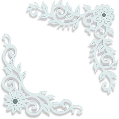 Pretty flower and leaf filigree corner die cutting and embossing die. Suitable for Scrapbooking, Journaling, Card Making and papercrafting. Compatible with most leading die cutting machines. Designed by Sue Dix. Set includes two corner dies.