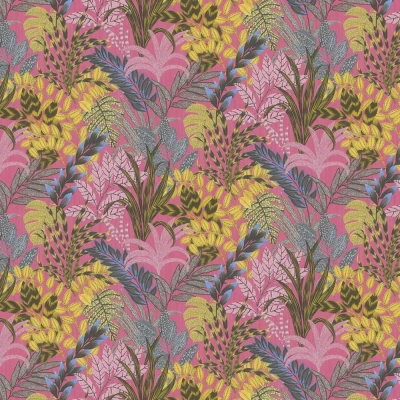 A stunning collection of assorted foliage overlaying against a bold background, showcasing several textures and patterns; filling your walls with depth and dimension. Seen here in the Pink colourway.