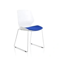 Stylish white shell general purpose chair. Slate grey fabric upholstery. Skid base. Shaped backrest for lumbar support.