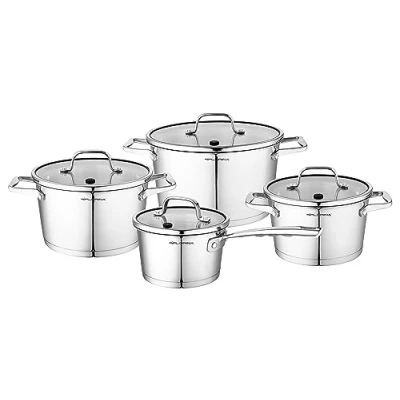 Everything you need: The cookware consists of 8 parts: 4 pots all with lids that cover all your needs when preparing delicious stews or warming up your food. Design and durability: they are characterised by an attractive design in shiny steel. Made from high quality materials that guarantee its strength and durability. Stainless steel: the body and handles of the cookware are made of high-quality stainless steel, ideal for everyday use. Due to its corrosion, high temperature and shock resistance, it is an ideal material for cooking. Functionality: the pots have a practical measuring scale engraved on the inside and their edges are shaped for easy pouring of liquids. The impact and scratch resistant tempered glass lids have a valve for steam outlet. Suitable for all types of cookers: the pans can be used on all types of cookers: vitro ceramic hob, electric hob, gas stove and induction hob. They are also dishwasher safe. Optimal heat distribution: the thick multi-layer base distributes heat evenly and ensures quick and efficient cooking for perfect cooking. Complete set: 24 cm cooking pot (5 litres), 20 cm cooking pot (3 litres), 18 cm cooking pot (2 litres), 16 cm cooking pot (1.5 litres), all with tempered glass lid included., Manufacturer: Florina