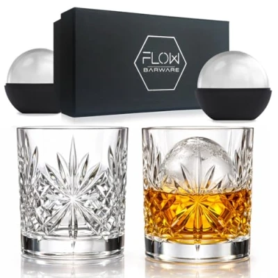 SET OF 2 WHISKEY GLASSES - This Classic Whiskey Glass Set offers modern style, with an air of the traditional. Inspired by the opulence of the 1920’s, these whisky glasses just ooze sophistication & are perfect for serving spirits & short cocktails, comes complete with 2x large ice ball moulds STUNNING WHISKY TUMBLER DESIGN - Simple, beautiful and intricately patterned, these weighty 300g whiskey tumblers sit comfortably in the hand, and have a wonderfully thin sipping rim. An impressive way to serve your favourite Single Malt, Special Blend or Old Fashioned Cocktails & a great addition to any home bar WHISKY GLASSES SET OF TWO - Lead-Free glass for enhanced durability & clarity, these weighty whisky glasses are comfortable to hold and are perfect for toasting those all important special occasions & celebrations. Dishwasher safe and chip resistant, they are a practical choice for everyday use and make the perfect home bar gift for a whisky lover. LARGE CAPACITY HEAVY BASE WHISKY GLASS - With a large 310ml capacity this unique whiskey glass set is the ideal glass for whiskey & for serving Scotch on the rocks, Gin & Tonic or Vodka & Coke. They also make the perfect Rum Glass or Negroni Glass STYLISH GIFT BOX - Complete with a stylish gift box, FLOW Barware’s Classic Whisky Glass can be used for formal dinner parties, yet durable enough for an everyday tipple. These Classic Crystal Whisky Glasses Set of two are a fabulous whisky gift idea for any Whisky lover, Bourbon drinker or Scotch lover. Whatever the occasion this Whiskey Glass Set is a fabulous gift idea. Whiskey Glass Size 9.5 x 8 x 8cm, Glass Capacity: 10.5oz / 310ml, Dishwasher safe