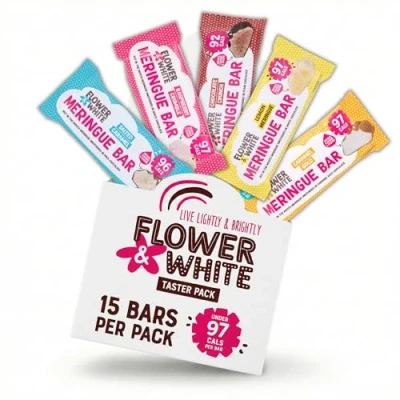Flower & White 15 Taster pack Meringue Bars Low Calorie, Gluten Free, Vegetarian, Natural Flavours (Raspberry Crumble, Lemon Meringue, Salted Caramel Gold) 15x 20g