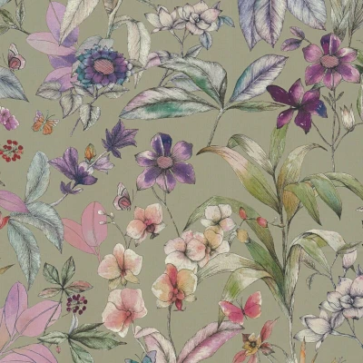 Flowers wallcovering wall Profhome 791873 hot embossed non woven wallpaper slightly textured with floral ornaments matt green grey olive violet cream