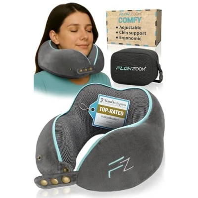 FLOWZOOM COMFY Travel Pillow for Airplane Neck Flight Memory Foam Pillows Adults Cushion Grey