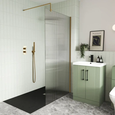 Fluted Brushed Brass Profile Wet Room Screen with Support Bar 800mm Wide 8mm Glass Hudson Reed