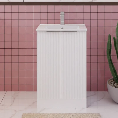 Fluted Floor Standing 2 Door Vanity Unit with Basin 500mm Wide Satin White Hudson Reed