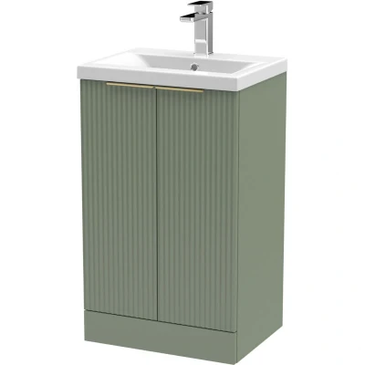 Fluted Front Floor Standing 2 Soft Close Door Bathroom Vanity Unit with 1 Tap Hole Ceramic Basin, 500mm, Satin Green, Brushed Brass Handles