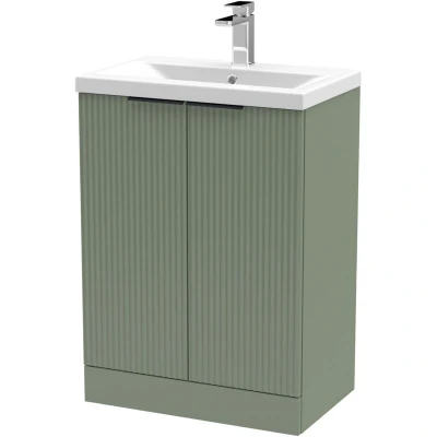 Fluted Front Floor Standing 2 Soft Close Door Bathroom Vanity Unit with 1 Tap Hole Ceramic Basin, 600mm, Satin Green, Black Handles