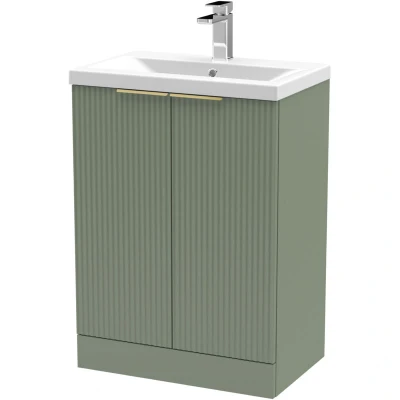 Fluted Front Floor Standing 2 Soft Close Door Bathroom Vanity Unit with 1 Tap Hole Ceramic Basin, 600mm, Satin Green, Brushed Brass Handles