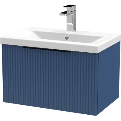 Fluted Front Wall Hung 1 Drawer Bathroom Vanity Unit with Tap Hole Basin, 600mm, Satin Blue, Black Handles