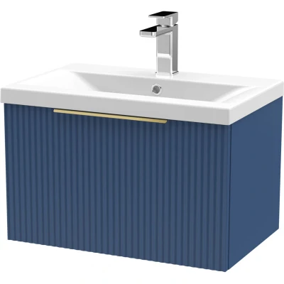 Fluted Front Wall Hung 1 Drawer Bathroom Vanity Unit with Tap Hole Basin, 600mm, Satin Blue, Brushed Brass Handles