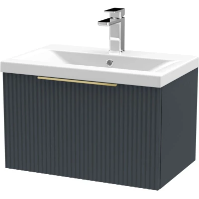 Fluted Front Wall Hung 1 Drawer Bathroom Vanity Unit with Tap Hole Basin, 600mm, Satin Dark Grey, Brushed Brass Handles