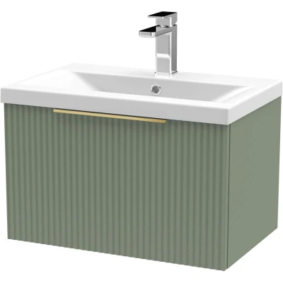 Fluted Front Wall Hung 1 Drawer Bathroom Vanity Unit with Tap Hole Basin, 600mm, Satin Green, Brushed Brass Handles