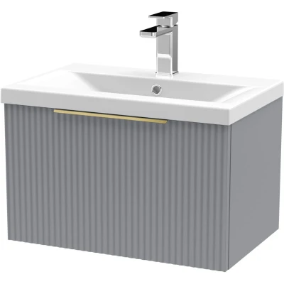 Fluted Front Wall Hung 1 Drawer Bathroom Vanity Unit with Tap Hole Basin, 600mm, Satin Grey, Brushed Brass Handles