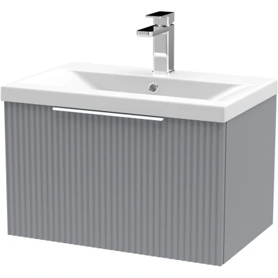 Fluted Front Wall Hung 1 Drawer Bathroom Vanity Unit with Tap Hole Basin, 600mm, Satin Grey, Chrome Handles