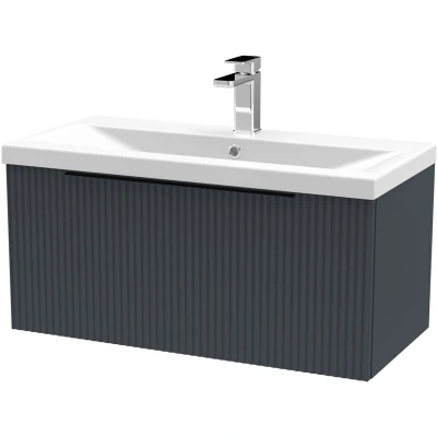 Fluted Front Wall Hung 1 Drawer Bathroom Vanity Unit with Tap Hole Basin, 800mm, Satin Dark Grey, Black Handles