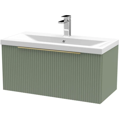 Fluted Front Wall Hung 1 Drawer Bathroom Vanity Unit with Tap Hole Basin, 800mm, Satin Green, Brushed Brass Handles