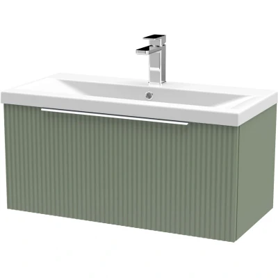Fluted Front Wall Hung 1 Drawer Bathroom Vanity Unit with Tap Hole Basin, 800mm, Satin Green, Chrome Handles