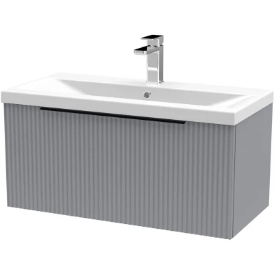 Fluted Front Wall Hung 1 Drawer Bathroom Vanity Unit with Tap Hole Basin, 800mm, Satin Grey, Black Handles