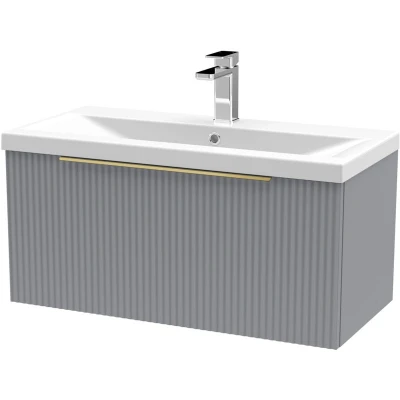 Fluted Front Wall Hung 1 Drawer Bathroom Vanity Unit with Tap Hole Basin, 800mm, Satin Grey, Brushed Brass Handles