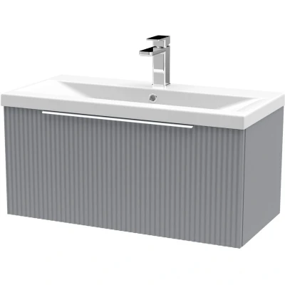 Fluted Front Wall Hung 1 Drawer Bathroom Vanity Unit with Tap Hole Basin, 800mm, Satin Grey, Chrome Handles