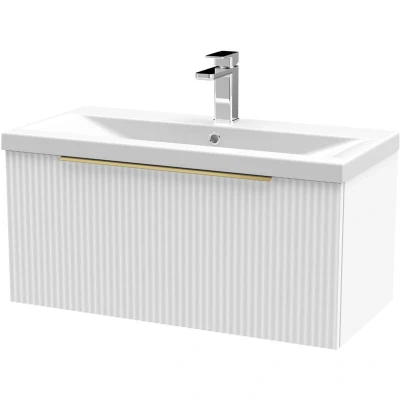 Fluted Front Wall Hung 1 Drawer Bathroom Vanity Unit with Tap Hole Basin, 800mm, Satin White, Brushed Brass Handles