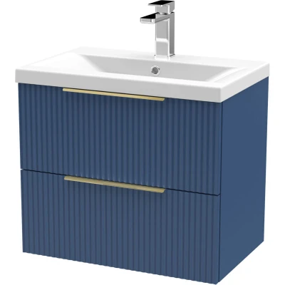 Fluted Front Wall Hung 2 Drawer Bathroom Vanity Unit with 1 Tap Hole Basin, 600mm, Satin Blue, Brushed Brass Handles