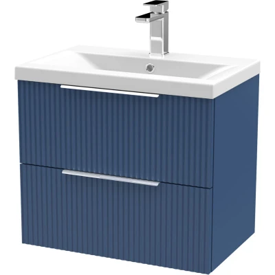 Fluted Front Wall Hung 2 Drawer Bathroom Vanity Unit with 1 Tap Hole Basin, 600mm, Satin Blue, Chrome Handles