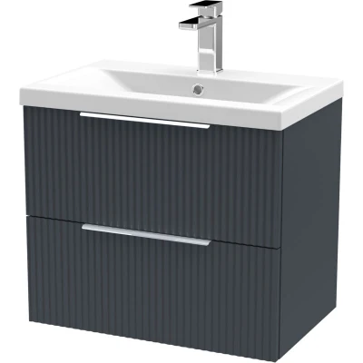Fluted Front Wall Hung 2 Drawer Bathroom Vanity Unit with 1 Tap Hole Basin, 600mm, Satin Dark Grey, Chrome Handles