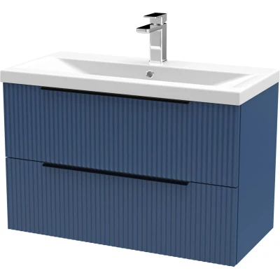Fluted Front Wall Hung 2 Drawer Bathroom Vanity Unit with 1 Tap Hole Basin, 800mm, Satin Blue, Black Handles