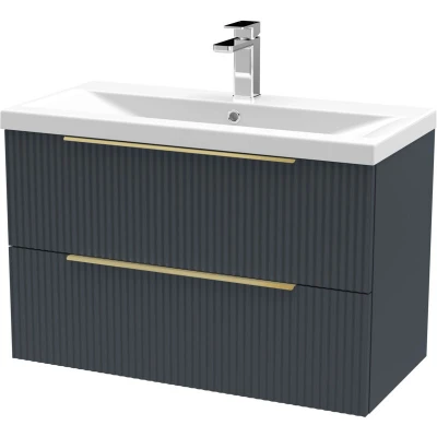 Fluted Front Wall Hung 2 Drawer Bathroom Vanity Unit with 1 Tap Hole Basin, 800mm, Satin Dark Grey, Brushed Brass Handles