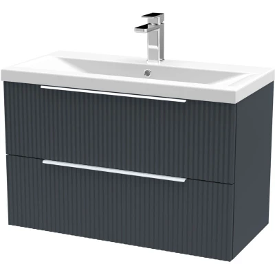 Fluted Front Wall Hung 2 Drawer Bathroom Vanity Unit with 1 Tap Hole Basin, 800mm, Satin Dark Grey, Chrome Handles