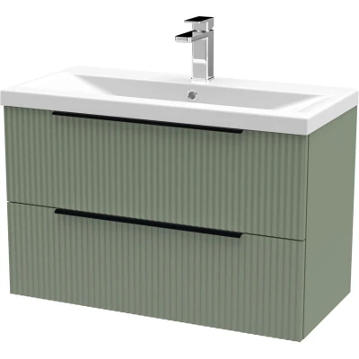 Fluted Front Wall Hung 2 Drawer Bathroom Vanity Unit with 1 Tap Hole Basin, 800mm, Satin Green, Black Handles