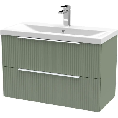 Fluted Front Wall Hung 2 Drawer Bathroom Vanity Unit with 1 Tap Hole Basin, 800mm, Satin Green, Chrome Handles