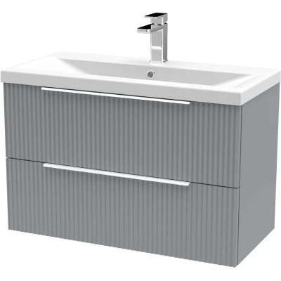 Fluted Front Wall Hung 2 Drawer Bathroom Vanity Unit with 1 Tap Hole Basin, 800mm, Satin Grey, Chrome Handles