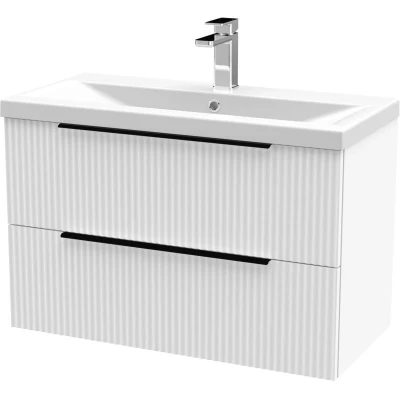 Fluted Front Wall Hung 2 Drawer Bathroom Vanity Unit with 1 Tap Hole Basin, 800mm, Satin White, Black Handles