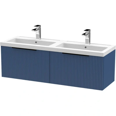 Fluted Front Wall Hung 2 Drawer Bathroom Vanity Unit with Double Basin, 1200mm, Satin Blue, Black Handles