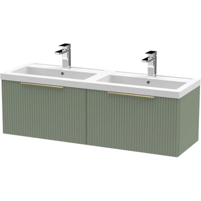 Fluted Front Wall Hung 2 Drawer Bathroom Vanity Unit with Double Basin, 1200mm, Satin Green, Brushed Brass Handles