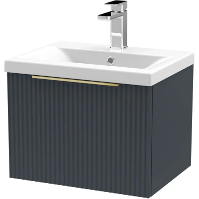 Fluted Front Wall Hung Single Drawer Bathroom Vanity Unit with 1 Tap Hole Basin, 500mm, Dark Grey, Brushed Brass Handles