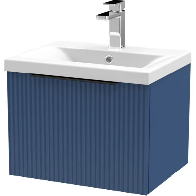 Fluted Front Wall Hung Single Drawer Bathroom Vanity Unit with 1 Tap Hole Ceramic Basin, 500mm, Satin Blue, Black Handles