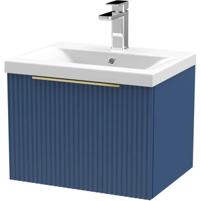 Fluted Front Wall Hung Single Drawer Bathroom Vanity Unit with 1 Tap Hole Ceramic Basin, 500mm, Satin Blue, Brushed Brass Handles